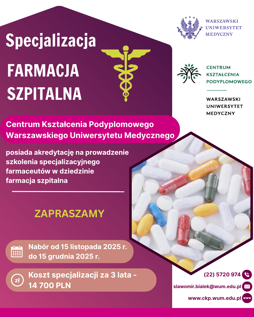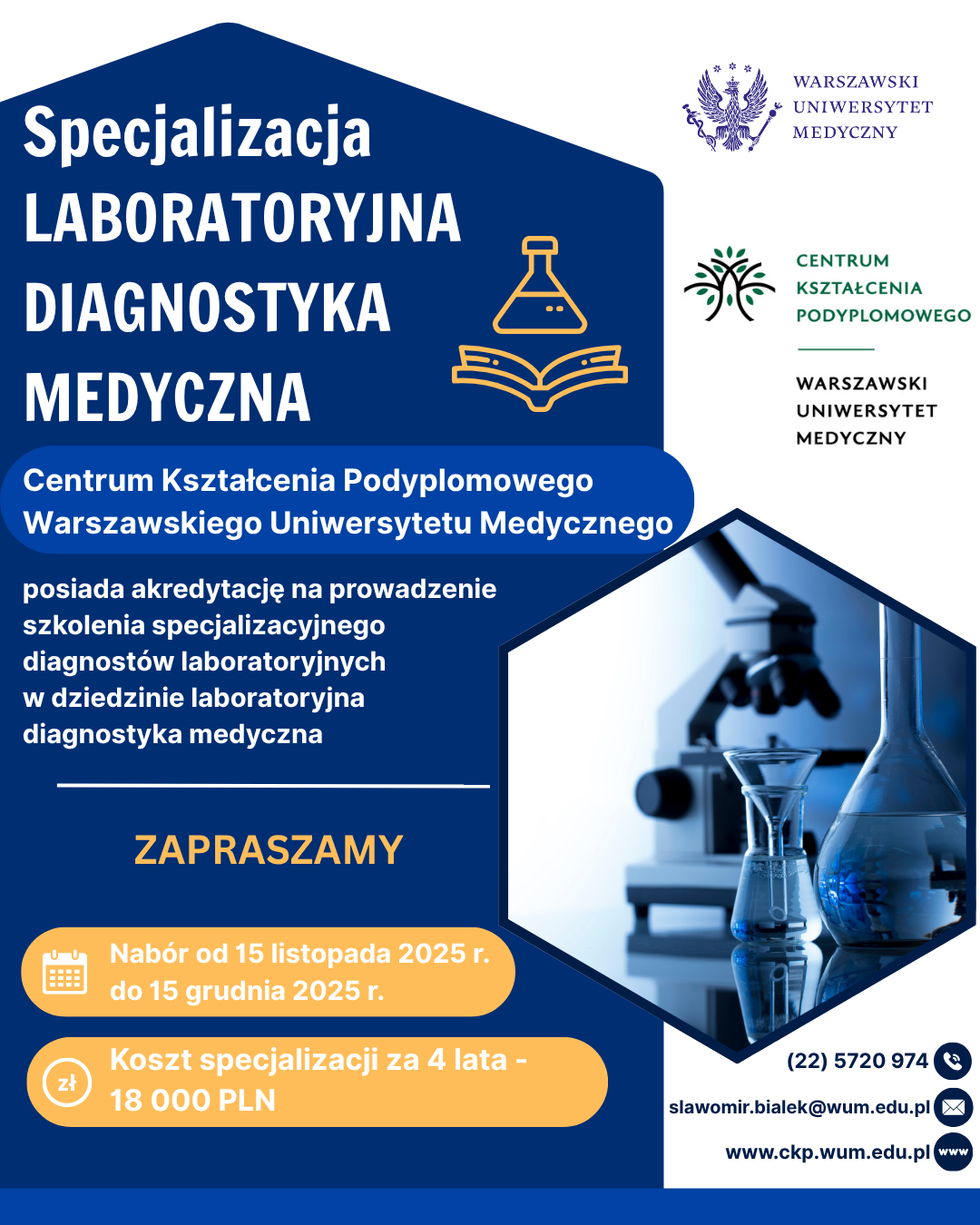 Centrum Kształcenie Podyplomowego Warszawskiego Uniwersytwtu medycznego posiada akredytację na prowadzenie szkolenia specjalizacyjnego diagnostów laboratoryjnych w dziedzienie farmacja szpitalna. Nabór rusza już 15 listopada 2025 r.